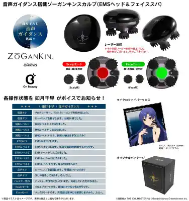 本コラボレーションモデルは、本体天面に如月千早武道館単独公演 「OathONE」をイメージしたモチーフを配置し、「如月千早」新規録り下ろしボイスを搭載。電源オンやオフ、Scalpモード、Faceモード、回転レベル、EMS等、各操作に応じてガイドしてくれるオリジナルボイス計15ワードを楽しみながら頭皮や表情筋のケアが可能です。尚、「如月千早」描き下ろしイラストマイクロファイバークロスを付属します。