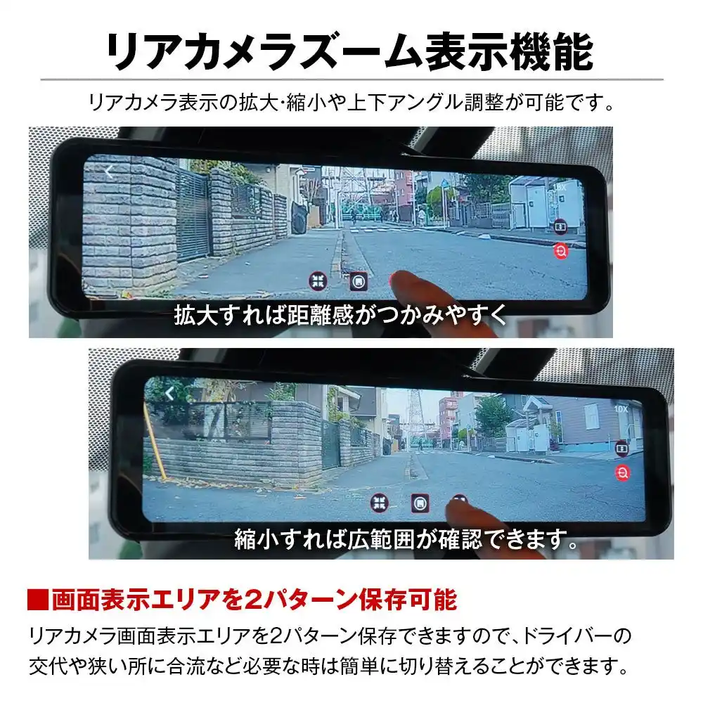 60FPSのリアカメラ、高輝度液晶モニター、GPSを本体に内蔵した10.88インチのデジタルルームミラーです。 |