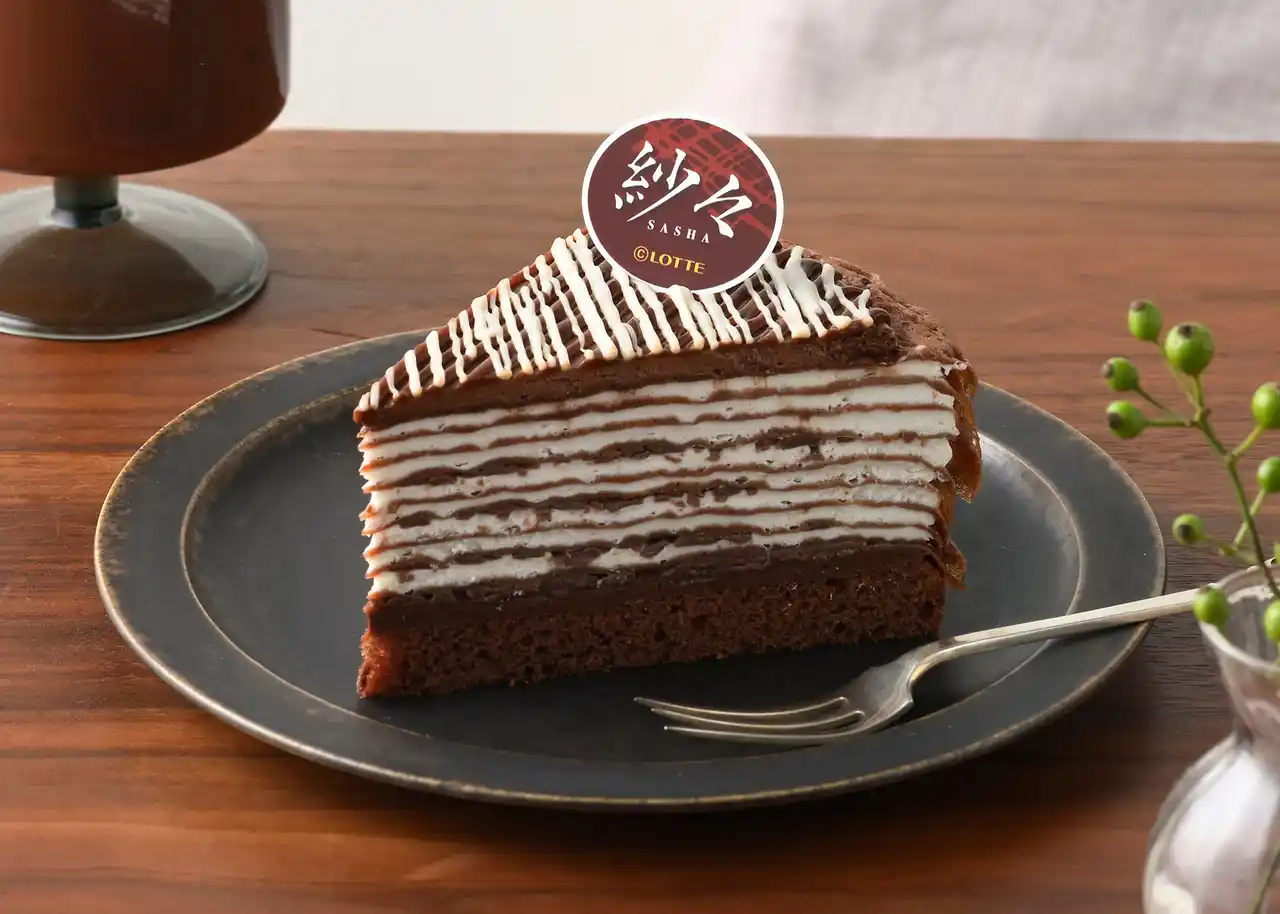 特長:銀座コージーコーナーの「ミルクレープ」とロッテのチョコレート「紗々」がコラボレーション。ココアクレープと生クリーム入りホイップクリームを重ねて、パリパリチョコを4層にサンド。上面は2種のソースで細い線が幾重にも重なる「紗々」をイメージして仕上げました。「紗々」の繊細な見た目や、ほどける口どけ、チョコレートのパリパリ食感をお楽しみください。 |