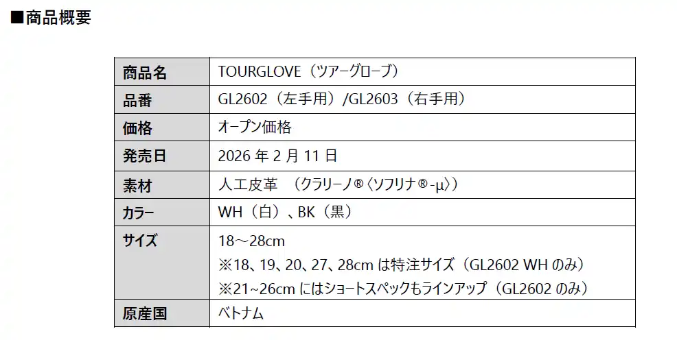 ブリヂストンスポーツ株式会社は、雨・汗に強く素手感覚のフィット感を追求したゴルフグローブ 『TOUR GLOVE』(GL2602)を、2月11日に発売します。価格はオープンです。 |