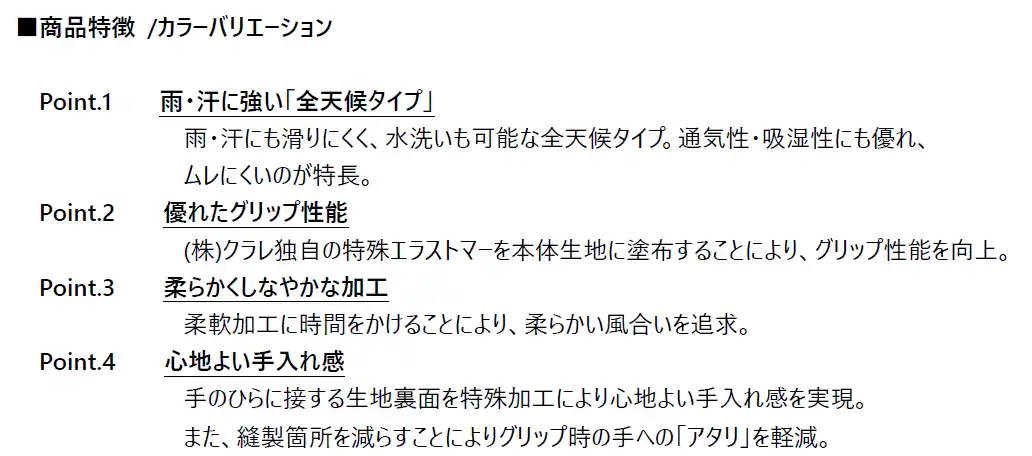 『TOUR GLOVE』は、株式会社クラレと共同開発の人工皮革クラリーノ(R)〈ソフリナ(R)-μ〉を使用し、柔軟加工に時間をかけることで柔らかい風合いを追求すると共に、手のひらに接する生地裏面の加工処理によって手入れ感の向上を追求しています。厳しい気象条件下においても高いグリップ性能と繊細なフィーリングを求めるツアープロが要望する高いグリップ性能とフィット感を維持しています。 |