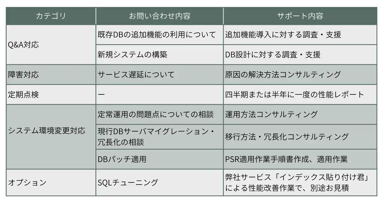 お客様先にDB技術者が常駐するのではなく、【必要になった時】に【必要な作業内容と作業量】をオンデマンドに対応致します。お問い合わせに対して専門のエンジニアが電話とメールで対応致します。直接データベースサーバへアクセスするような対応の場合は、当社内からのリモートアクセスにて対応(条件によりオンサイトでも対応)致します。 |