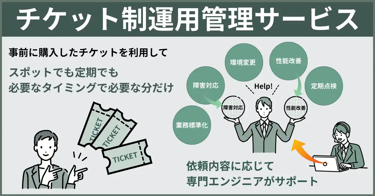 チケットを利用してご依頼いただいた内容に対し、お客様の環境を把握した専任の運用支援チームが、お客様専任の担当コンサルタントとしてお客様の窓口となり、課題解決に向けて対応・支援します。お電話/メールでのサポート、そして必要に応じてオンサイト対応を致します。 |