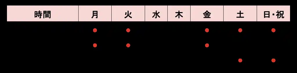 | 土日祝:10:30~14:00 / 15:00~18:30 | ||||||||||||||