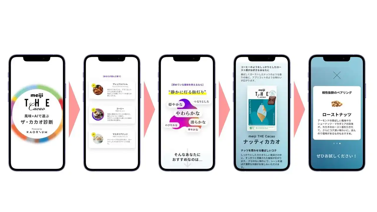 AIシステム「KAORIUM」との共同開発で、好きな香りの傾向からおすすめのチョコレートを診断します。カカオの香りの違いを知り、自分の好みを発見する体験ができます。診断結果では「メキシコ産ホワイトカカオの生ねりと黒文字のカヌレ」「マダガスカル産カカオの生ねりと黄金梅の“生マシュマロ”」「ナッティカカオのカフェモカ」「フルーティカカオのチャイラテ」「マダガスカル産カカオの生ねりフランボワーズメレンゲサンド」「ナッティカカオのスパイスサブレ缶」「ナッティカカオのキャラメルサブレ缶」「フローラルカカオのバレンタイン上生菓子」など限定商品のリコメンドもあり、本イベントだけで体験できる商品やペアリングといった診断結果を楽しめます。 |