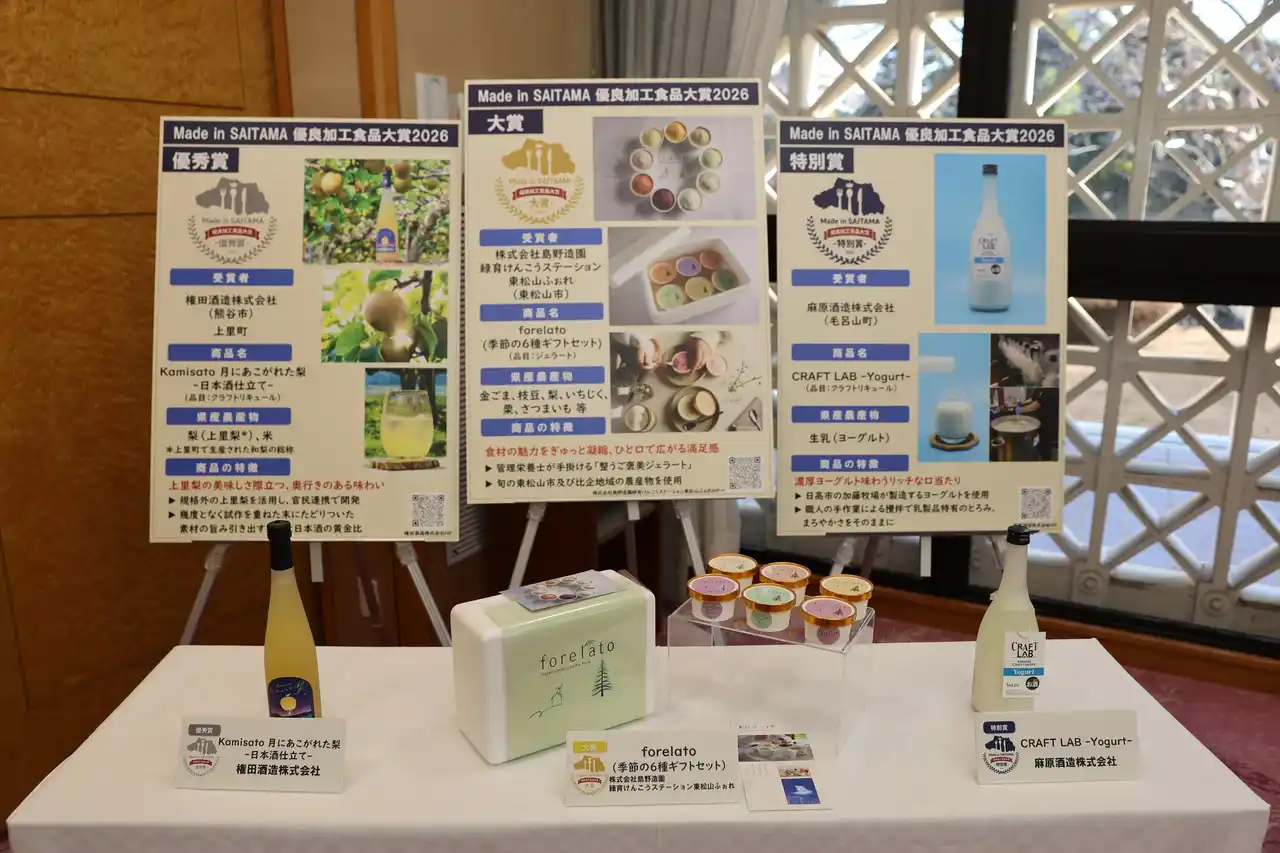 「Made in SAITAMA 優良加工食品大賞」は、埼玉県が主催する県産農林水産物を活用した加工食品の品評会で、県産品の需要拡大と食品産業の発展を目的に設けられています。食味、独自性、地域資源活用、商品性、将来性など8つの観点から審査されることが特徴です。今年度は県内から37商品がエントリーし、一次審査を通過した11商品が最終審査へ進出。その中から大賞・優秀賞・特別賞が選出されました。 |
