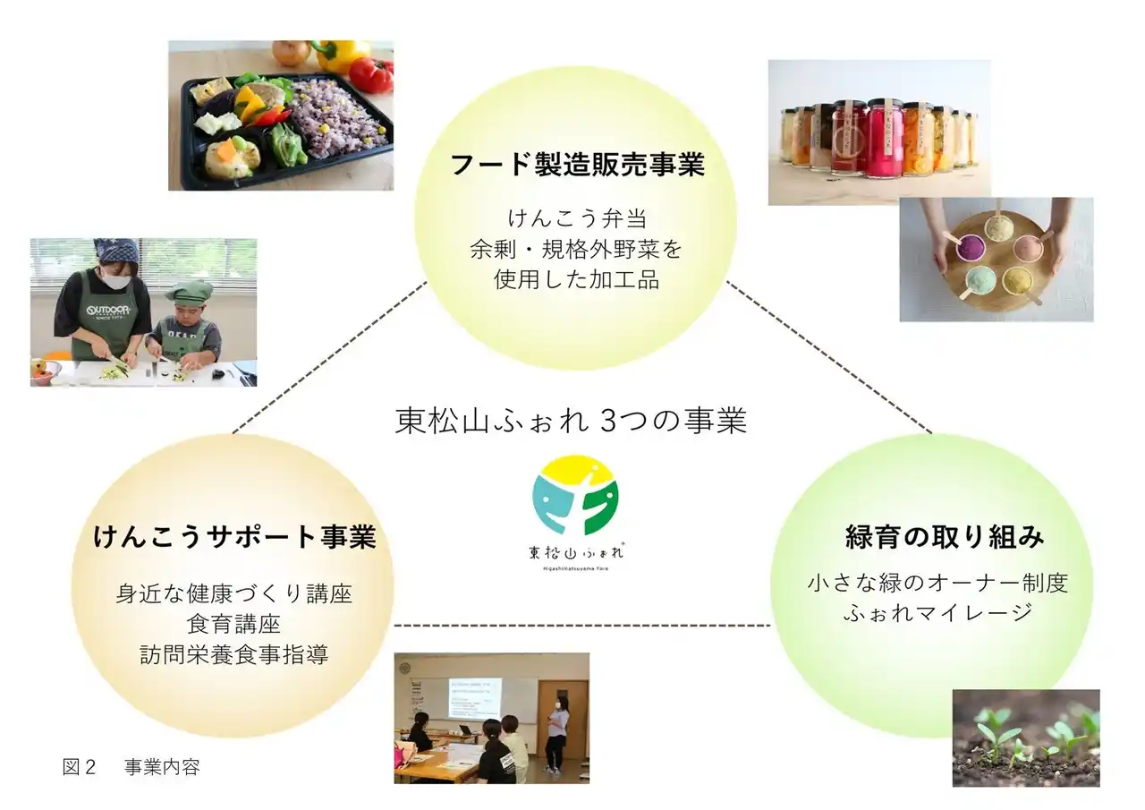 <事業内容>フード製造販売事業,けんこうサポート事業,緑育の取り組み |