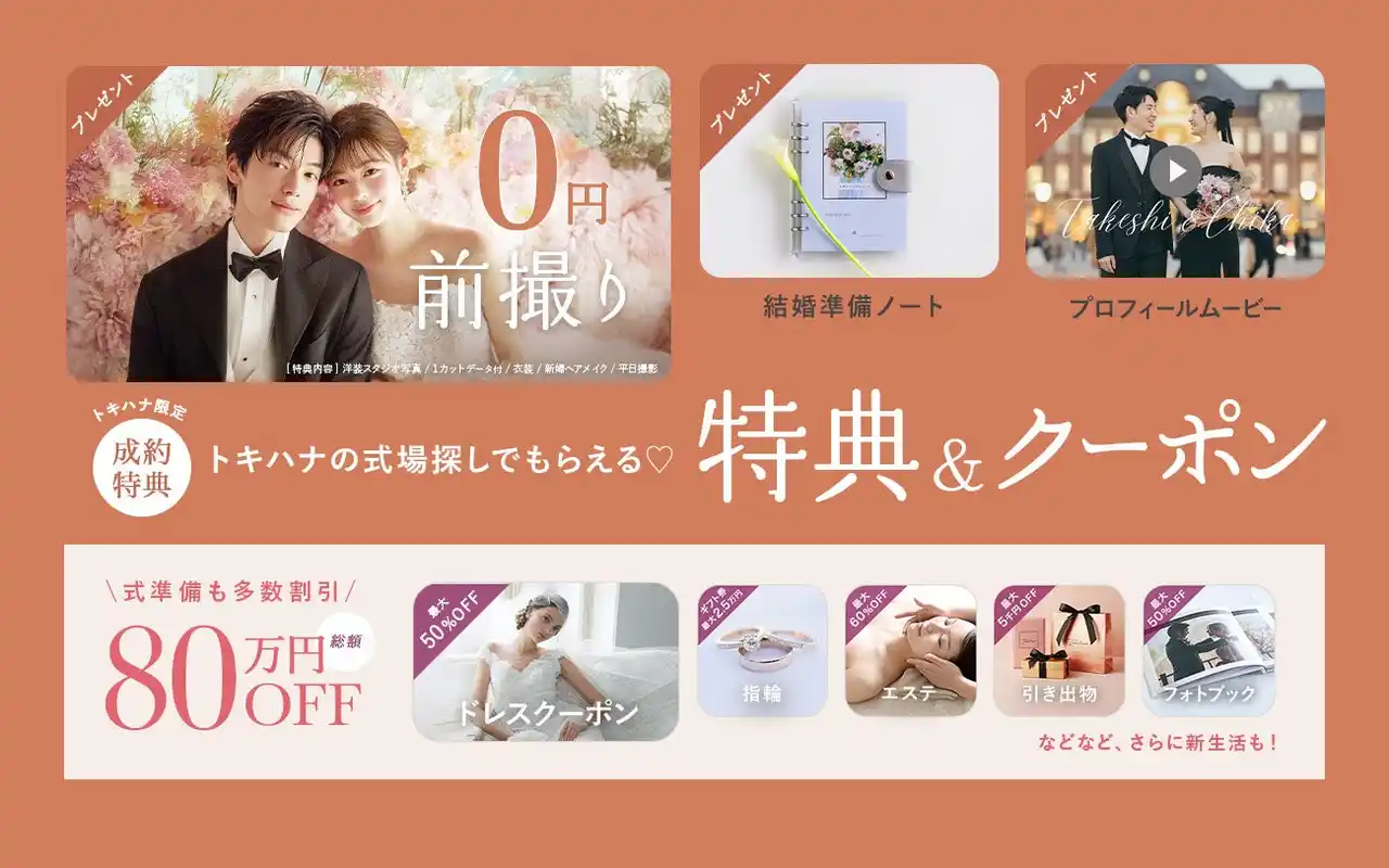 | トキハナで式場を決めると、前撮り/ドレス/エステなどの結婚式準備もお得に |