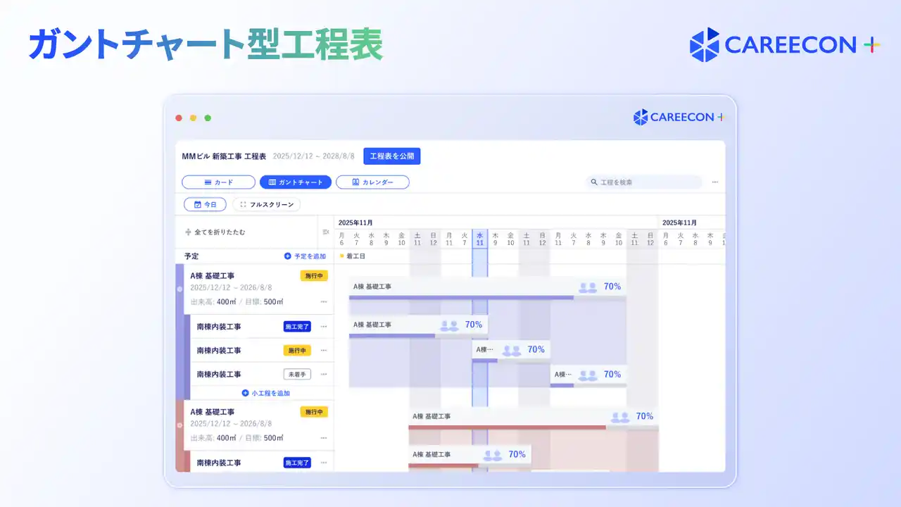 | 今回のアップデートでは、工程表のUI/UXを改善し、表示方法として「ガントチャート」「カレンダー」「カード」の3つの形式を用意しました。現場の規模や工期、管理スタイルに応じて表示を切り替えられるようにすることで、確認したい情報にアクセスしやすくし、日々の工程管理をより直感的に行えるようにしています。 | |||