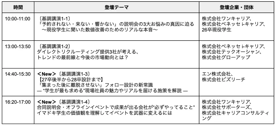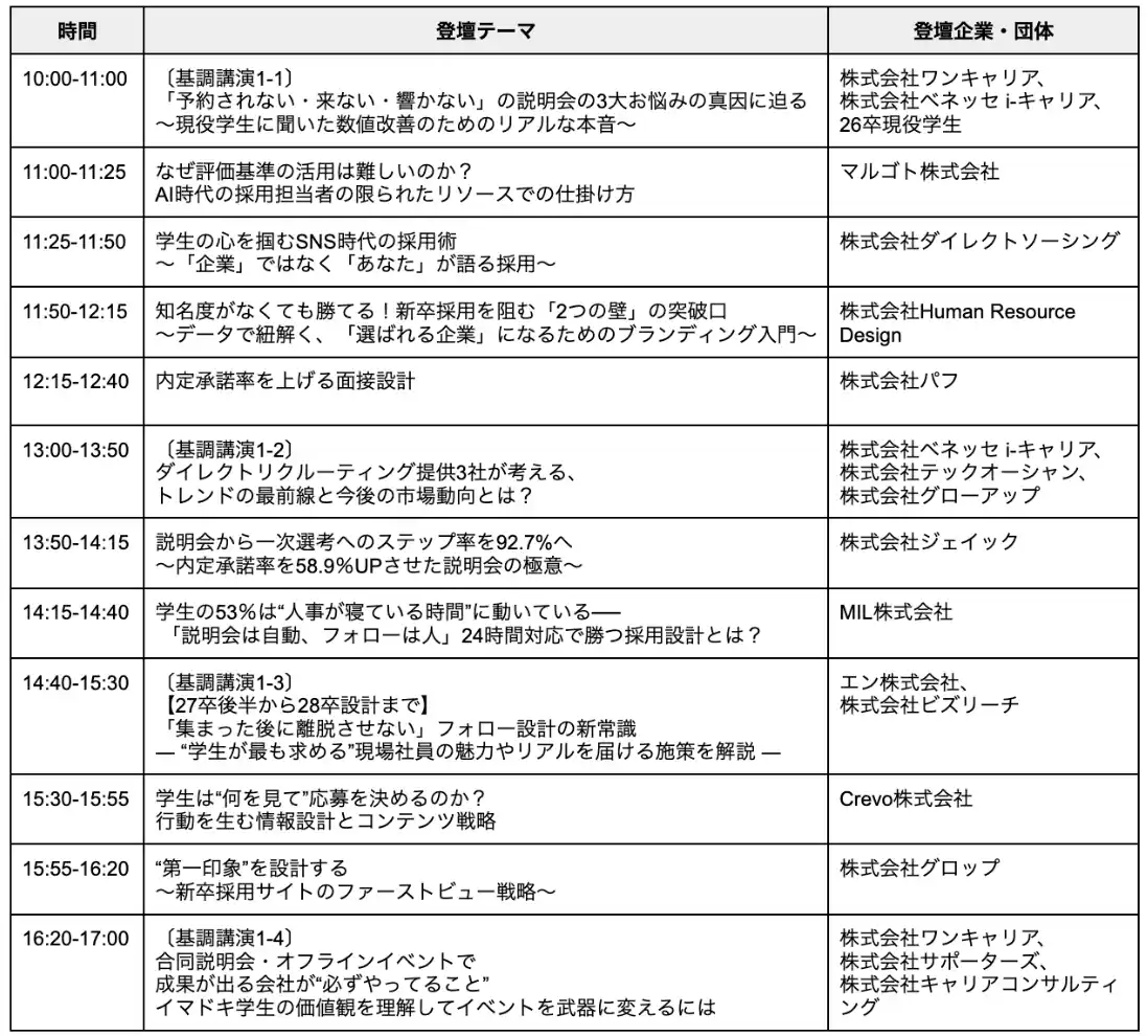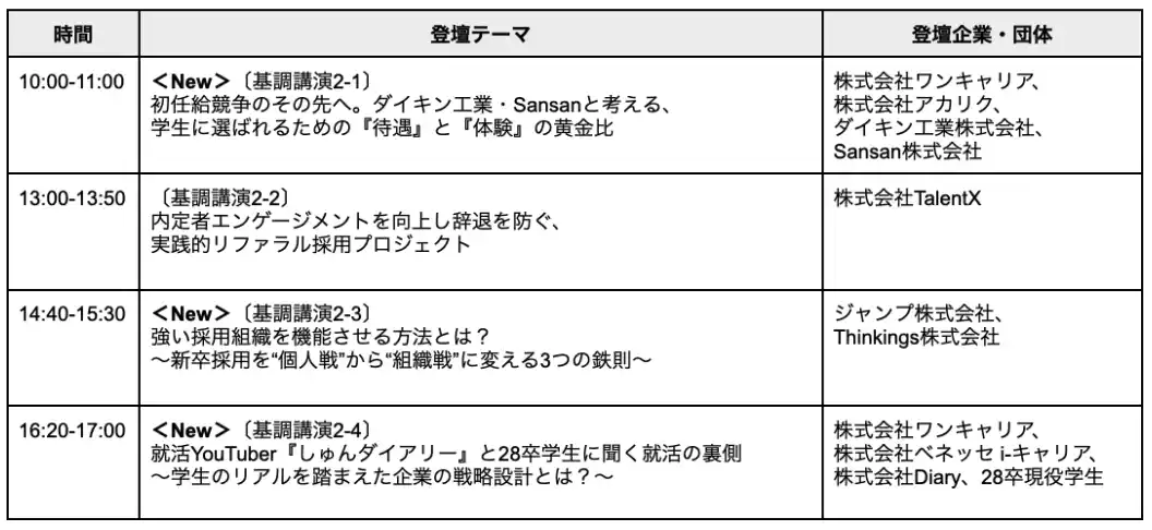 | 新たに決定した基調講演では、27卒・28卒の採用を見据えた最新の戦略を軸に、現場社員の巻き込み方やオフラインイベントの必勝法など、より実践的なコンテンツを拡充しました。 | |||