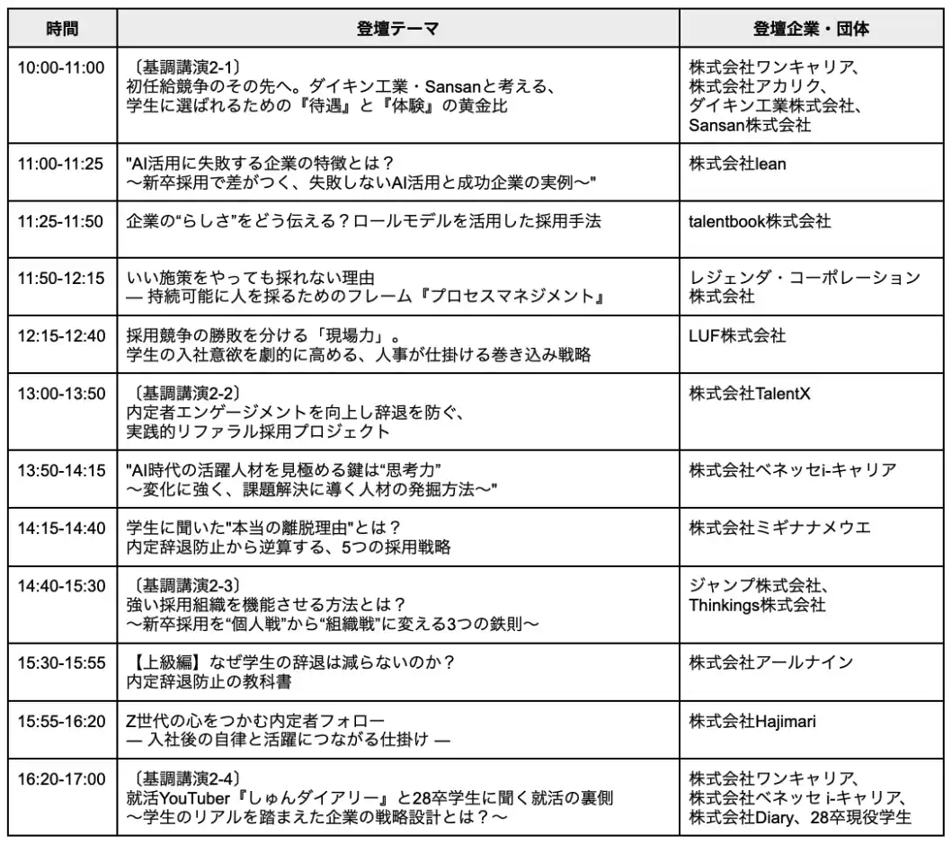 | ダイキン工業・Sansanの2社を招いた“待遇と体験の黄金比”に関する議論や、登録者数30万人超の就活YouTuber「しゅんダイアリー」運営者と28卒現役学生による“就活の裏側”を深掘りするセッションなど、計5セッションを新たに追加。学生のリアルな本音と、企業の組織力強化の両面から、新卒採用を成功に導くための新常識を提示します。 | |||