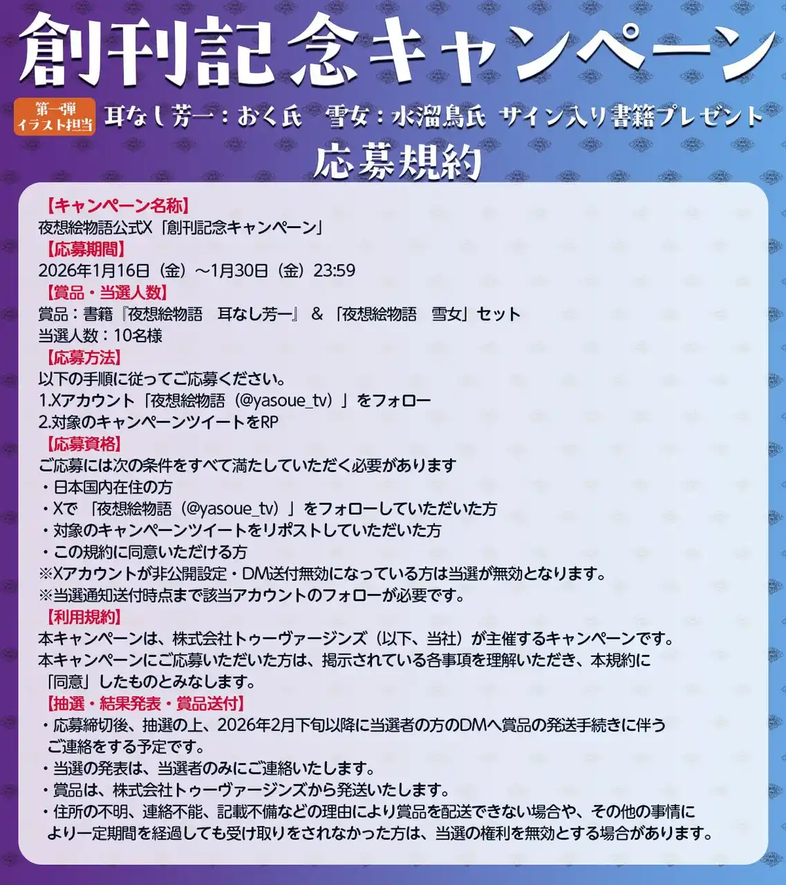 応募方法:夜想絵物語公式Xアカウント(@yasoue_tv)をフォローしたうえで、キャンペーンの案内投稿をリポスト |