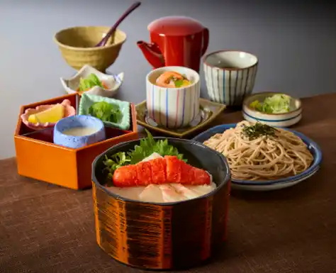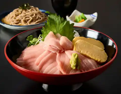 「まぐろの女王」と称される南まぐろ。その最高級部位である“大とろ”のみをふんだんに使用し、贅沢な素材を頬張る「丼」に盛り付けました。口に入れた瞬間、際立つ脂の甘みと濃厚かつ芳醇な味わいが広がり、とろけるような至福のおいしさが溢れます。サガミ自慢の蕎麦をセットでご提供しております。さっぱりと口を整えながら、“大とろ”の深い味わいをぜひ心ゆくまでご堪能ください。 |