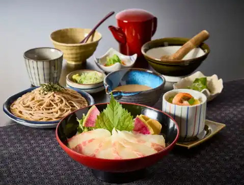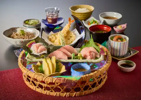 南まぐろ“大とろ”を、王道の刺身・芳醇なごまだれ・磯香る手巻きの三種の味わいでご提供。旬を告げる「筍のお刺身」やサガミ自慢のお蕎麦をはじめ、天ぷら、茶碗蒸し、小鉢、ご飯、漬物、デザートまで。多彩な料理が織りなす豊かな味わいを、ぜひ心ゆくまでお楽しみください。 |