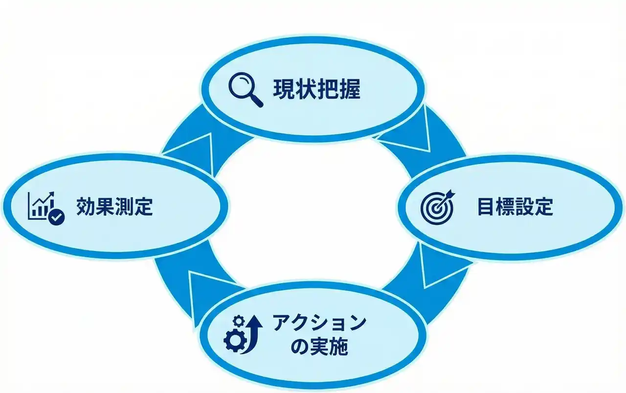 現状把握により判明した問題や課題に応じた効率的な改善目標や計画の策定を、お客様主体で行えるよう支援します。 |