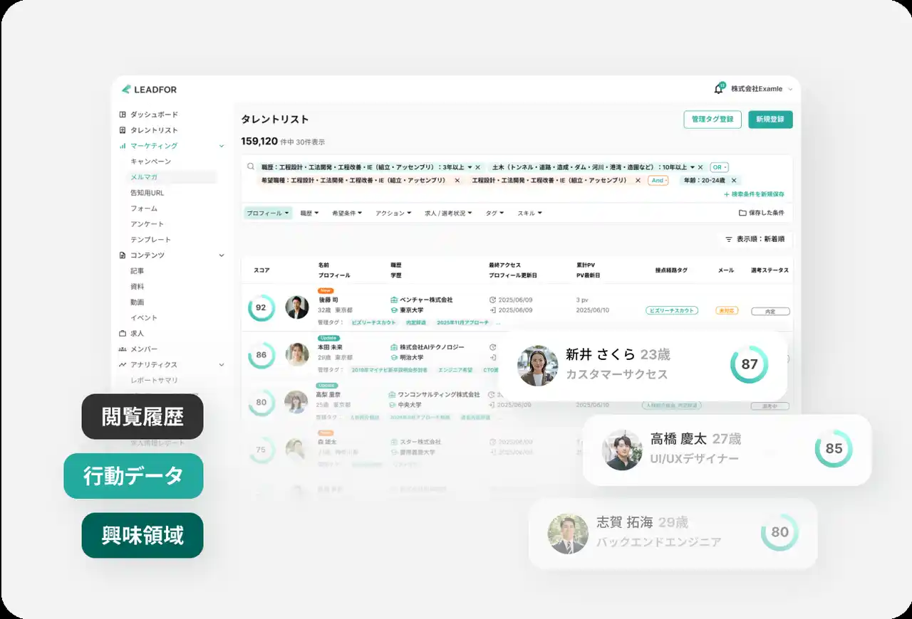 LEADFORは、候補者の行動データや志向データをもとに、企業に対する関心度を定量化。 |