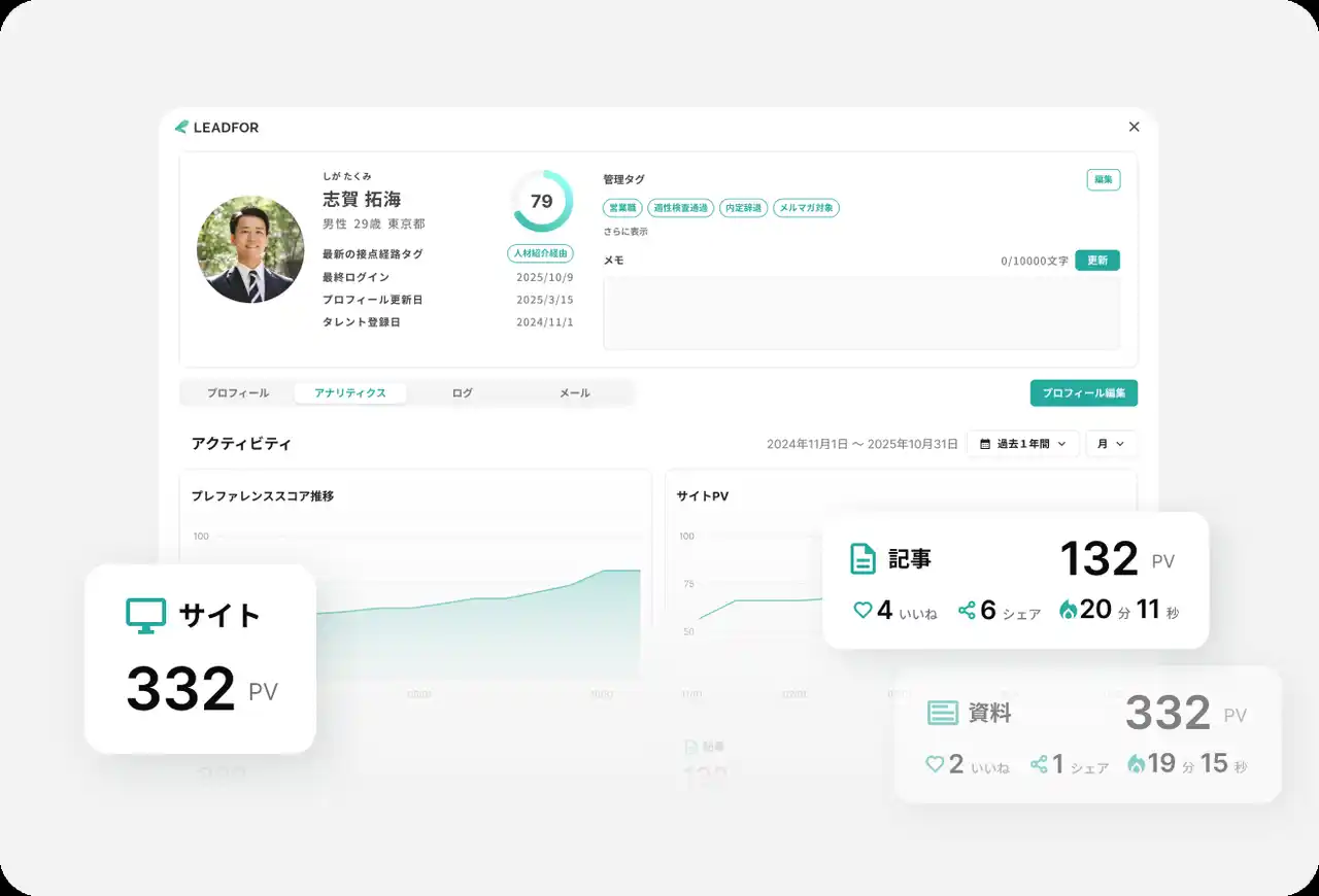 プレファレンスリクルーティングとは、候補者の行動や意向を可視化し、そのデータに基づきLEADFOR独自アルゴリズムで算出した企業への好意度「プレファレンススコア」を起点に、最適なアプローチや選考体験を設計・運用する採用手法です。 |