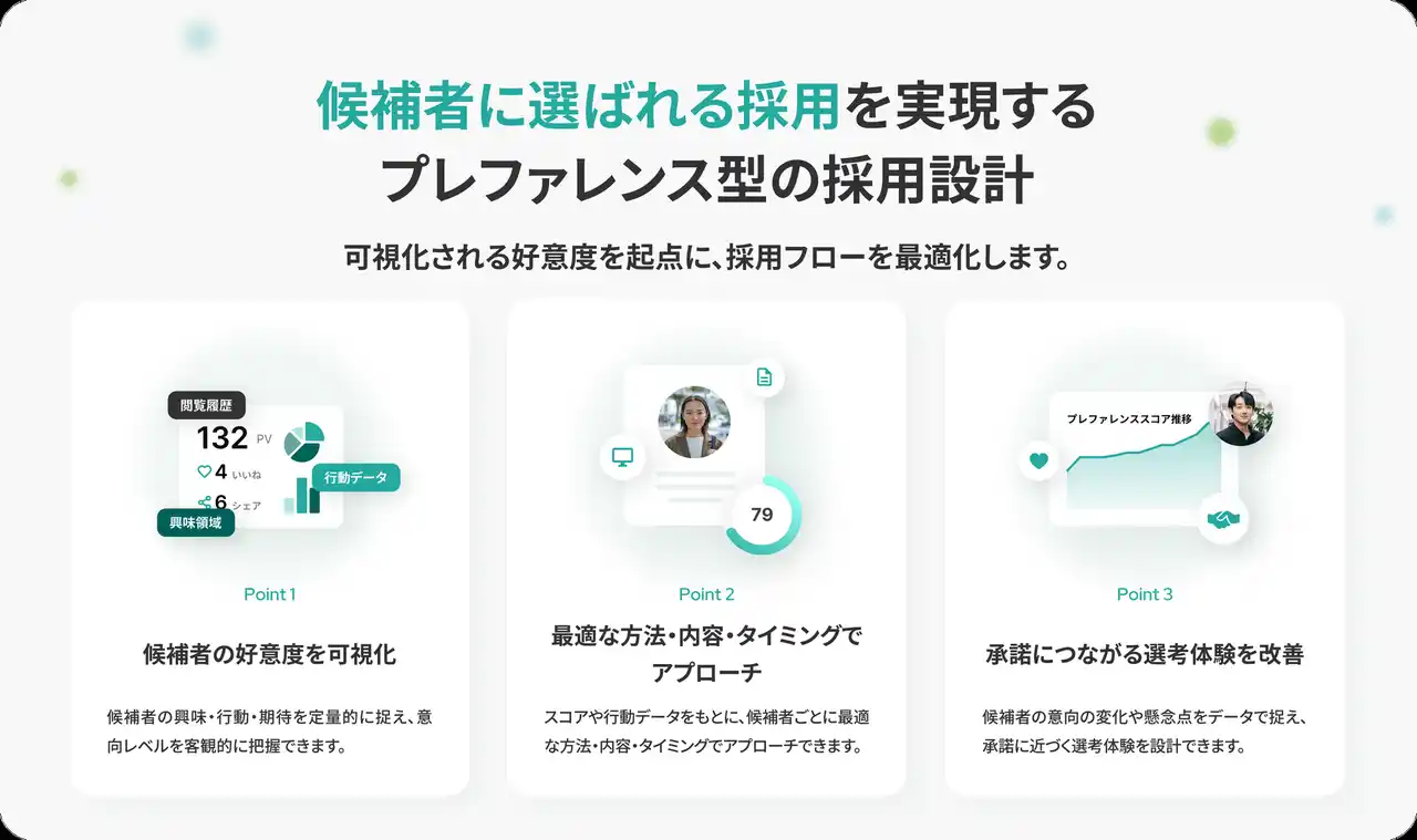 このような課題に対し、LEADFORは候補者の意向や関心の変化を可視化し、それを前提に採用プロセス全体を個別に設計・運用する新しい採用の考え方として、「プレファレンスリクルーティング」を提唱しています。 |