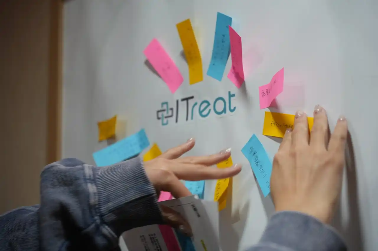 ビジョンマップでは、ボードの中央にITreatのロゴを配置し、その周囲に社員が付箋を貼りながら、自身の想いを書き出していきました。 |