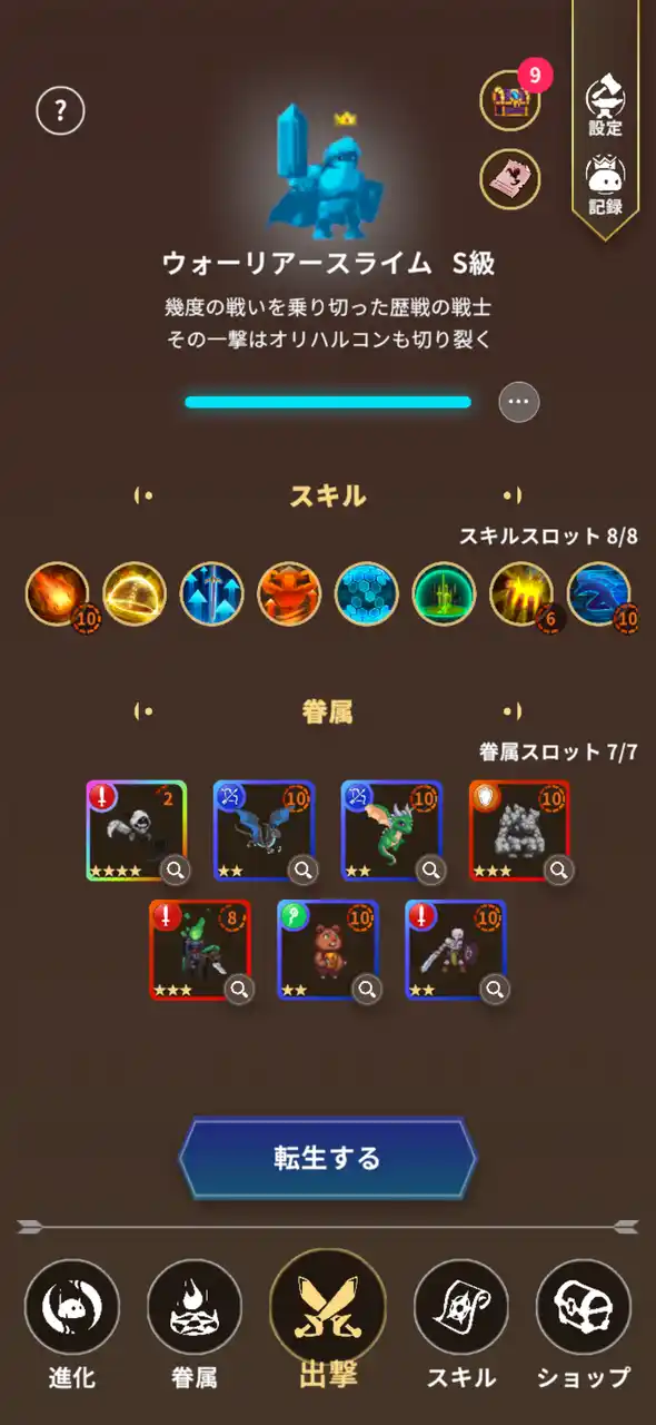 眷属には、アタッカー・シューター・タンク・サポートの4タイプが存在します。進化したスライムと組み合わせ、最大7体まで自由に編成可能です。どの眷属を育て、どのスキルを組み合わせるか。プレイヤーの選択が、最強のパーティを生み出します。 |