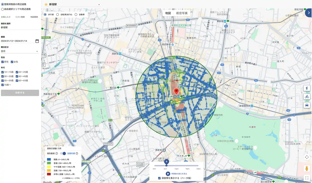 | これにより、Datawise Area Marketer 国内居住者版は、10代を含む日本全国の人流を高い精度で分析できるようになり、また、歩行者交通量・自動車交通量に加えて自転車交通量を日別で分析できるようになります。 | |||