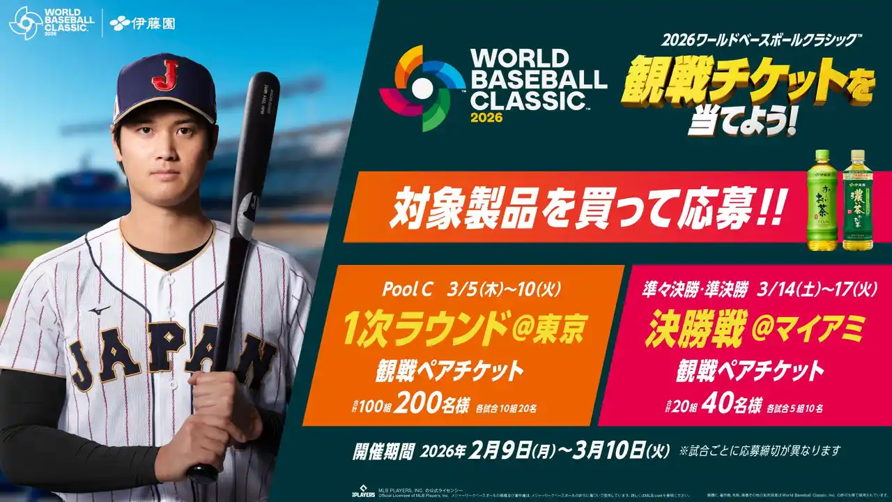| 株式会社伊藤園(代表取締役社長:本庄大介 本社:東京都渋谷区)は、2026年3月に開催される「2026 World Baseball Classic」のグローバルパートナーとなり、日本代表戦全4試合を観戦できるプレミアムなペアチケットが1組2名に当たるキャンペーンを2026年1月22日(木)より、さらに1次ラウンド(東京)および最終ラウンド(マイアミ)観戦ペアチケットが120組240名に当たるキャンペーンを2月9日(月)より開始します。また同日より、大谷選手の過去大会の活躍シーンやファンへ期待を呼びかける新作CMも順次公開します。 | |||||||