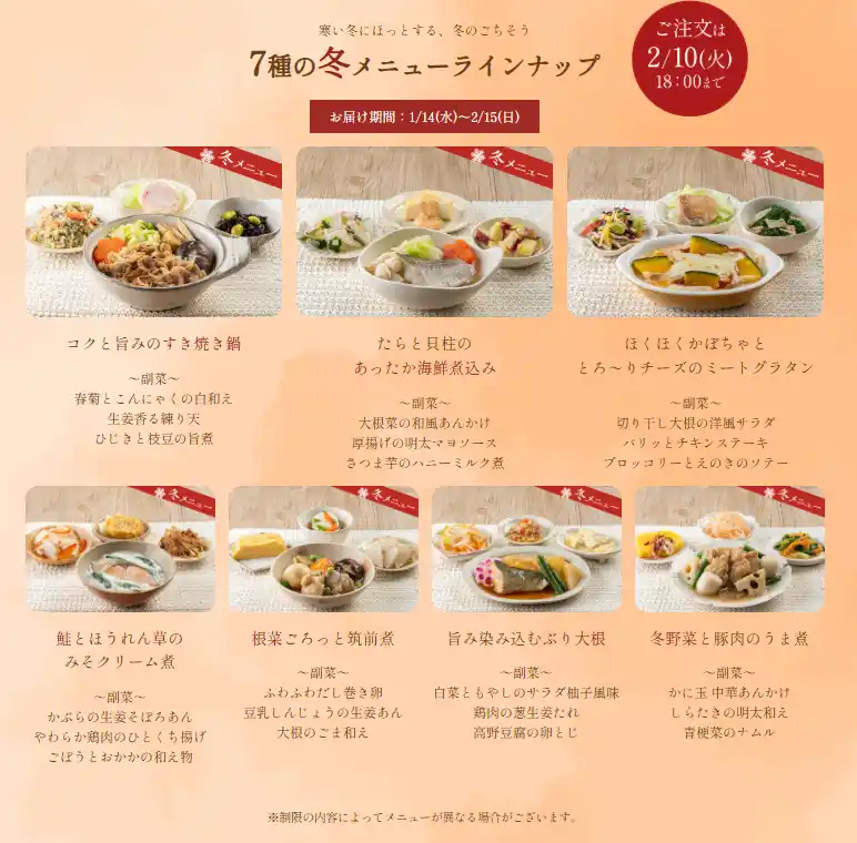 寒い季節に食べたくなる“あたたかい献立”をテーマに、管理栄養士が一品ずつ栄養設計と味づくりを監修。制限がある方でも、冬の食卓を安心して楽しめるよう仕立てています。販売期間は2026年2月10日(火)18:00までです。 |