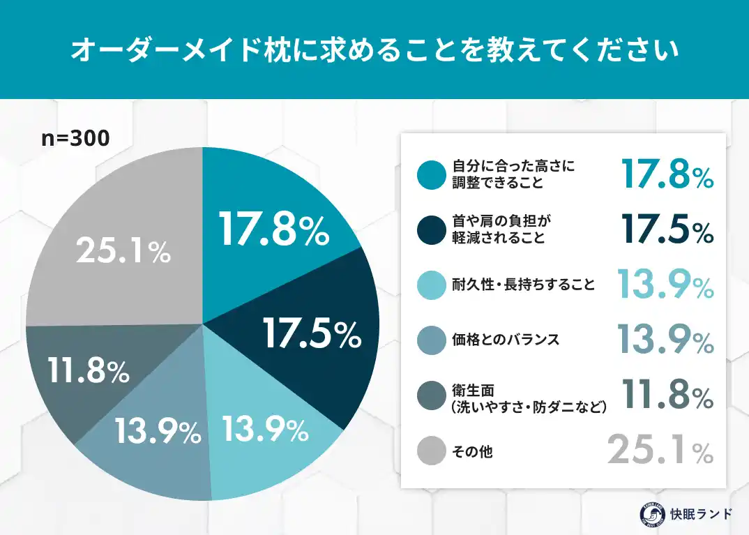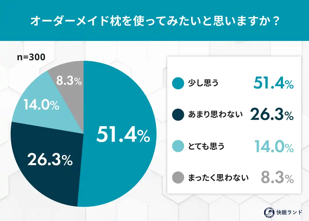 今回の調査から、オーダーメイド枕は広く知られている一方で、実際に使ったことがある人は少なく、関心と使用経験の間に大きな差があることが分かりました。「使ってみたい」と感じている人は多いものの、価格や購入時のハードルが高く、行動に移せていない層が多いと考えられます。また、求められているのは高級感よりも、「自分に合った高さ調整」や「首・肩への負担軽減」といった実用的な効果です。オーダーメイド枕は、必要性を感じながらも手が届きにくい“高価格帯の選択肢”として認識されており、より試しやすい形での提供が今後の課題だと言えるでしょう。 |