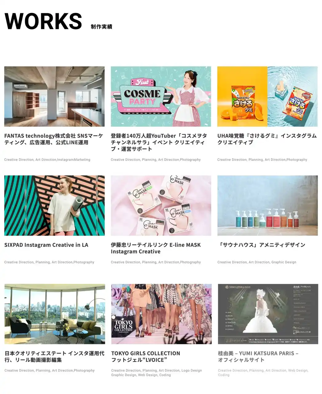 | 創業16年で、東証上場企業を含む約5000件以上を支援し、「SNS」「WEB」「広告」「デザイン」「動画」「インフルエンサー・モデルキャスティング」「イベント企画」などを通じて企業のブランド価値向上に貢献してきました。 | ||||||||||||