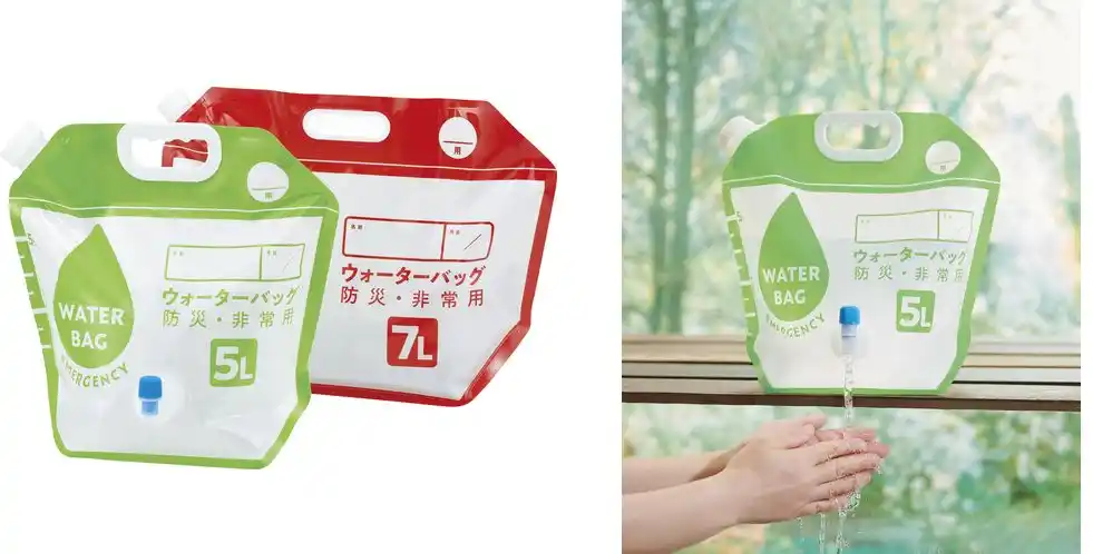 断水時などに活躍が期待できる、折りたためるウォーターバッグ。注ぐのに便利な蛇口付き。折りたためばコンパクトになるため、保管も簡単です。 |
