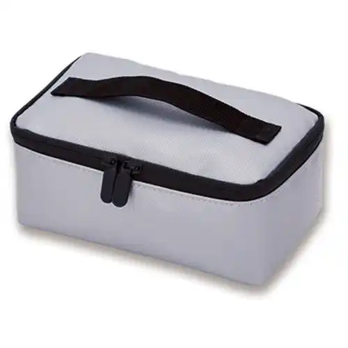 燃え広がりにくい防炎剤を使用した保管用ポーチ。いざというときにサッと持ち運べる持ち手つき。引き出しにも収まるコンパクトなサイズです。 |