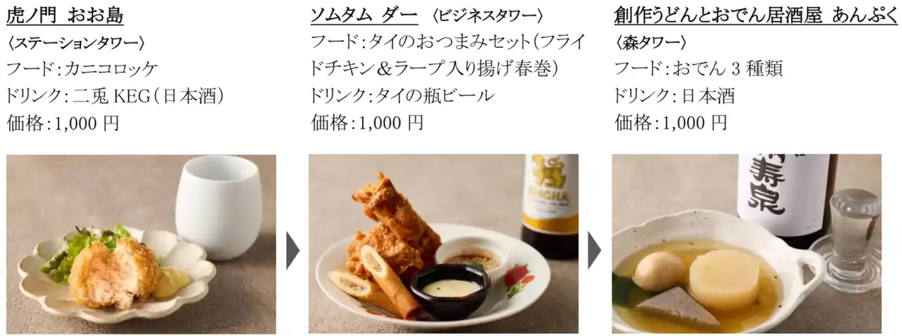 また、参加店舗は全て外に出ることなく移動可能なため、寒い冬でも気温を気にせず楽しめます。仕事仲間との一杯や、気心知れた友人との飲み歩き、贅沢気分を味わえる女子会、自分を甘やかすスイーツ巡りなど様々なシーンで、飲んで食べてお店を“ホッピング”する、名店が集う虎ノ門ヒルズならではの美食巡りをご堪能ください。 |