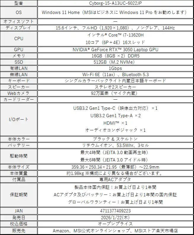 この度、エムエスアイコンピュータージャパン株式会社は、未来感あふれるサイバーパンクデザインと高性能を融合したゲーミングノートPC「Cyborg 15」シリーズより、「Cyborg-15-A13UC-6022JP」を本日2026年1月22日(木)より順次販売開始いたします。 |