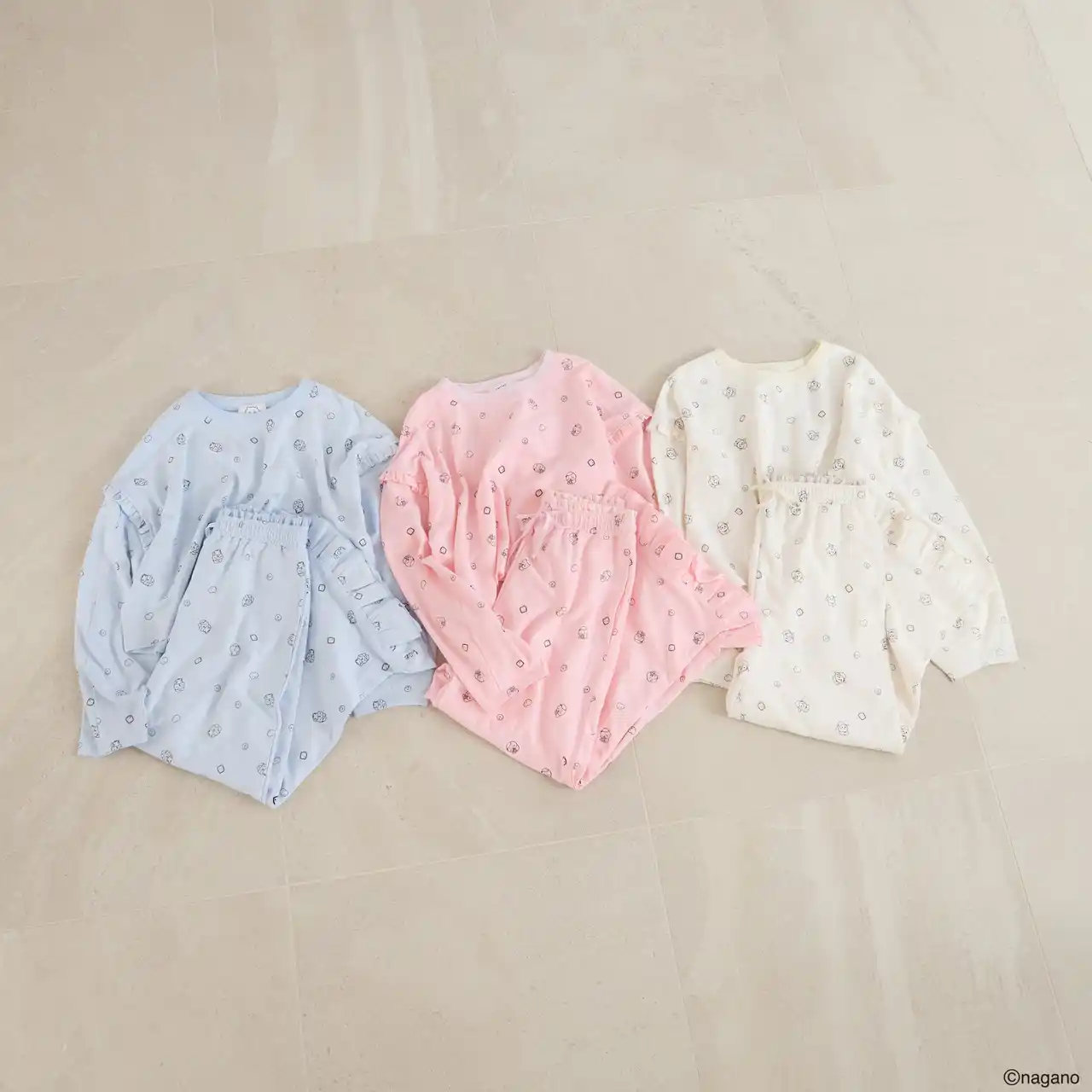 ちいかわ・ハチワレ・うさぎがすやすやと眠る姿をデザインした、愛らしいパジャマセット。 |