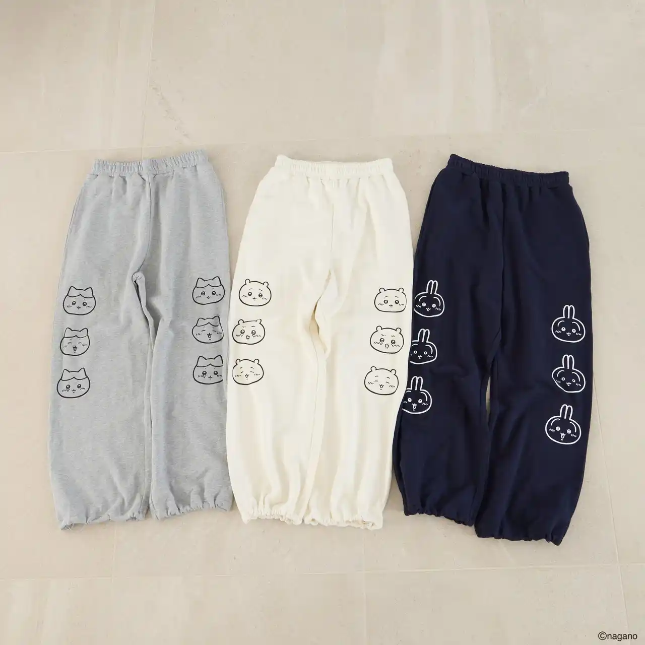 ちいかわたちの異なる表情をデザインした、遊び心のあるスウェットパンツ。 |