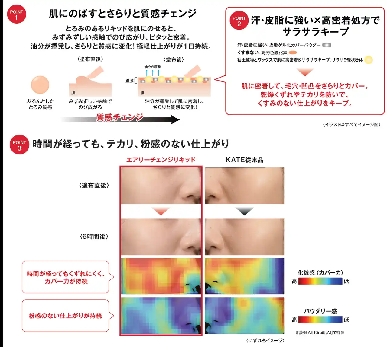 そこでKATEは、塗布時はみずみずしくのび広がり、肌に密着するとさらりとした質感に変化する処方を採用。テカリや乾燥くずれを防ぎ、極軽仕上がりをキープする新リキッドファンデーションを開発しました。 |