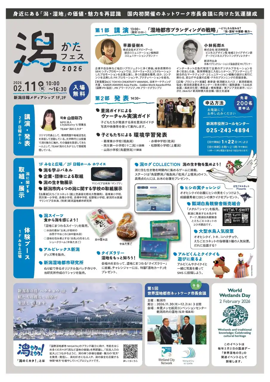 ● 本市の豊かな湿地の魅力、ラムサール条約の「湿地都市認証」や11月に国内で初めて開催される国際会議「世界湿地都市ネットワーク市長会議」について、より多く方々に知っていただくために、2年ぶりとなる「潟(かた)フェス」を開催します。 |
