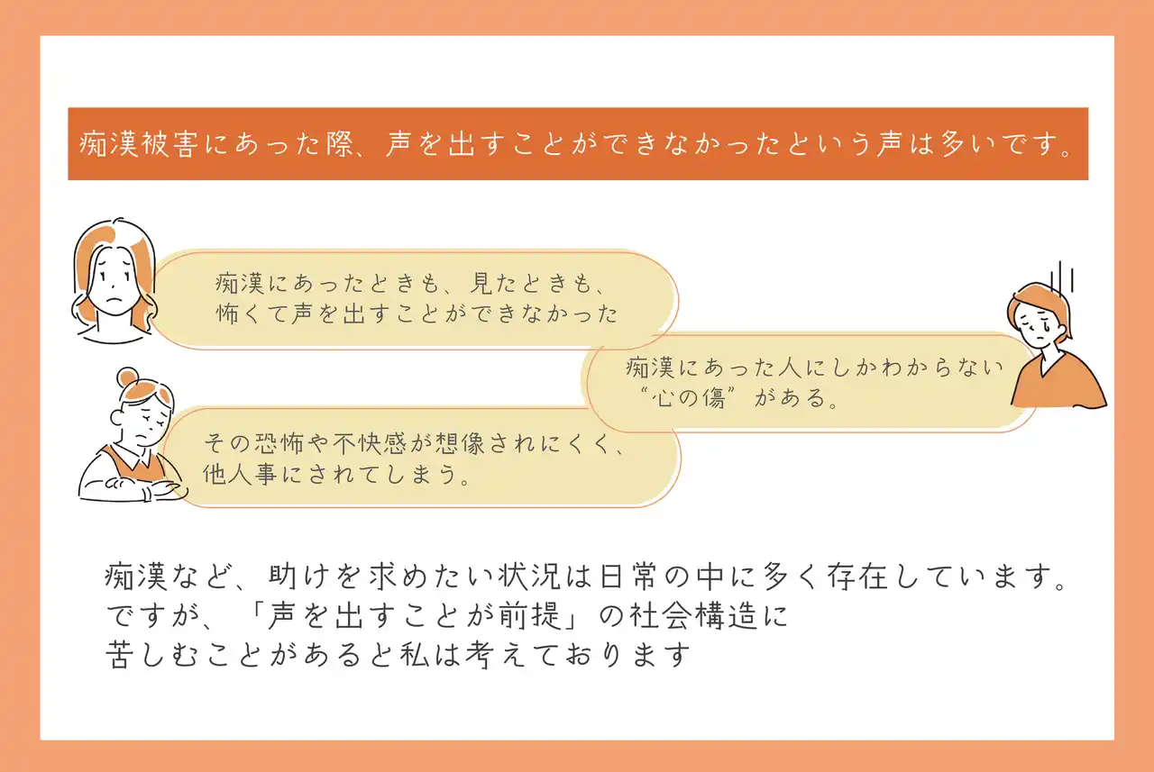| プロジェクト名:声を出せない痴漢被害者を支える社会の仕組みづくり(卒業制作) | |||