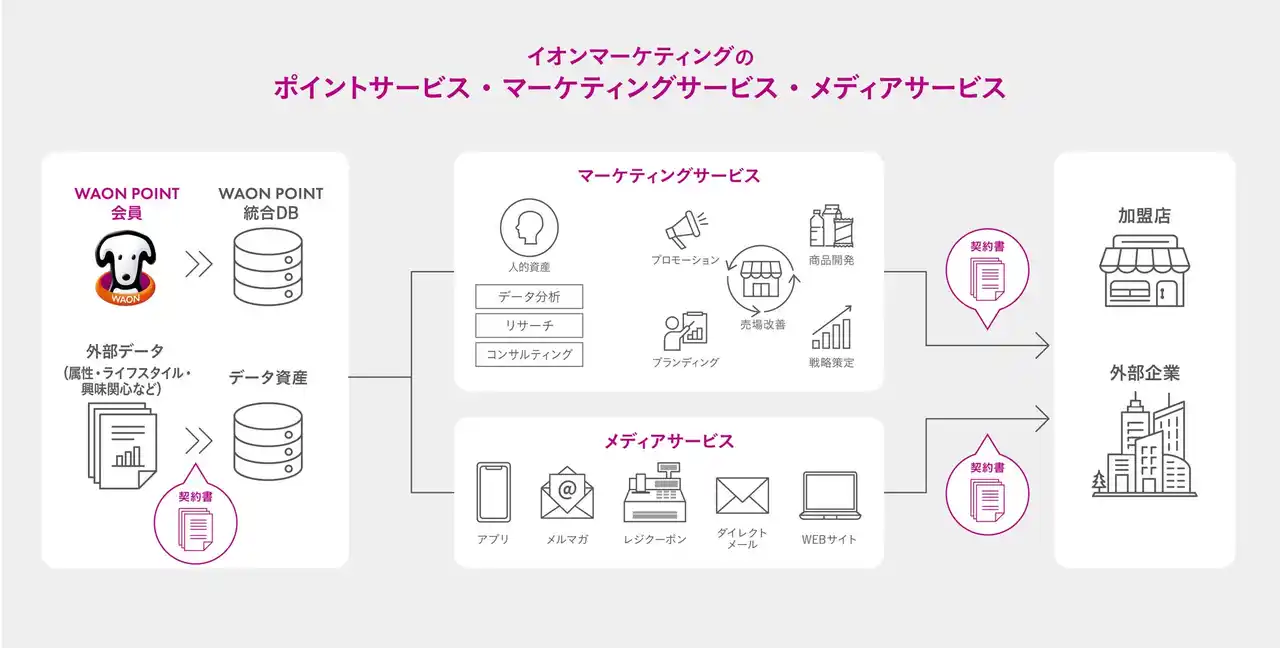 事業内容:WAON POINTサービス運営、マーケティングリサーチ、会員・POS情報を組み合わせた分析サービス、分析に基づく販促サービス |
