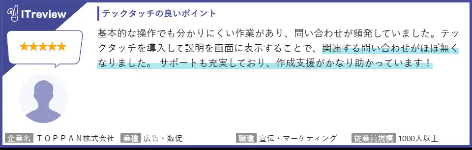 ・当社では自社開発した社内ツールにおいて、従来はポップアップによる操作説明を設置していましたが、新しいツールのため想定外の箇所でユーザーが戸惑い、結果的にツール利用を諦めてしまうケースが頻発していました。DAP導入後は、ユーザーが実際に迷いやすい箇所を特定し、適切なDAPを配置することで、ユーザーが戸惑うことが減り、問い合わせも削減することができました。また、新規機能のリリース時は従来見逃されがちでしたが、DAPを活用して実際の画面上で新機能を紹介することで、ユーザーの認知度と利用率が向上しました。これにより結果として、社内ツールの定着率向上と業務効率化を同時に実現できました。 |