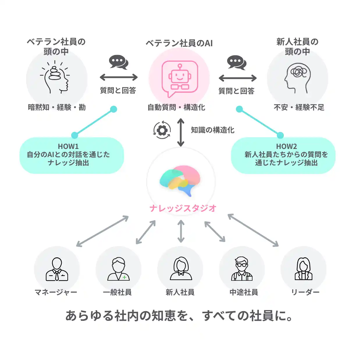 「Knowledge Studio(ベータ版)」は、 暗黙知とオンボーディングの領域に特化した対話型ナレッジプロダクトです。マニュアル整備や事前の文書化を前提とせず、 日々の業務の中で交わされる 「質問と回答」そのものを起点に、 人の中にある判断や経験をAIに反映し、 次の人へと引き継いでいく構造を採用しています。 |