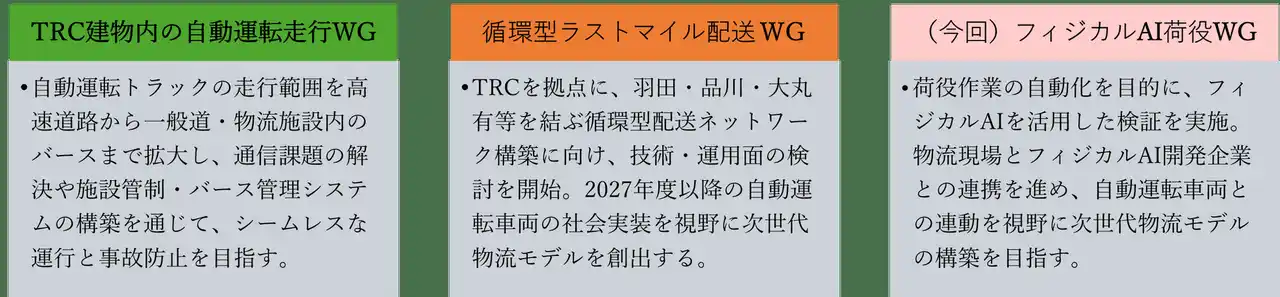 2025年12月にTRC建物内の自動運転走行WGと循環型ラストマイル配送WGを発足しました。TRC建物内の自動運転走行WGは、高速道路から一般道・物流施設内バースまで走行範囲を広げ、通信課題や管制システムを含めて検討します。循環型ラストマイル配送WGは、羽田空港・高輪・品川を結ぶ自動運転配送ネットワーク構築に向けた技術・運用検証を進めています。フィジカルAI荷役WGはこれらと連動し、シームレスな物流モデルの実現を目指します。