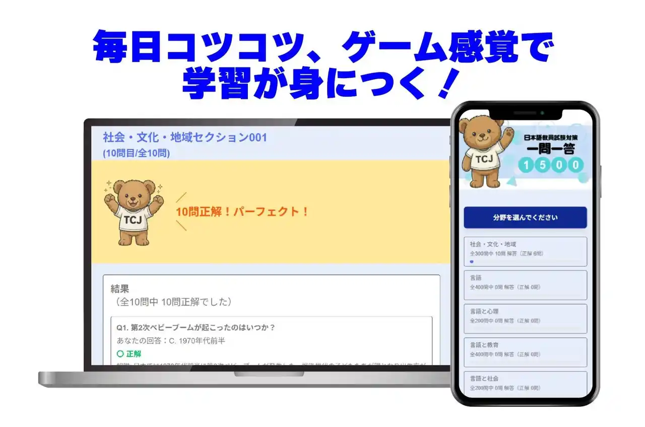 そのため、「学習時間の確保が難しい」「覚えた知識が定着しているか不安」「直前期に効率よく総復習したい」といった課題を抱える受験者が少なくありません。こうした背景を受け、TCJグローバルでは、短時間でも反復学習が可能で、理解度を即座に確認できるクイズ形式に着目し、日本語教員試験対策に特化した一問一答型Webアプリの開発に至りました。 |