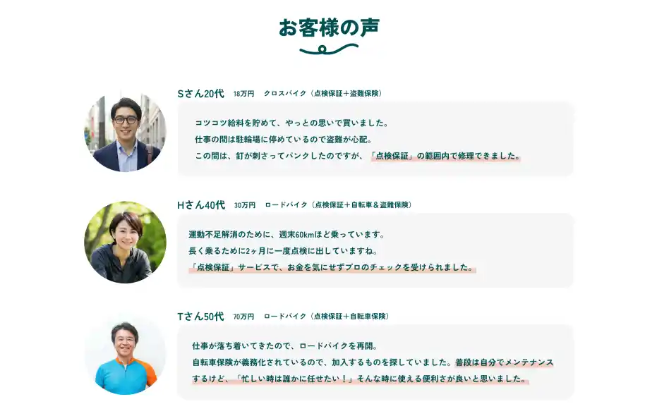 「18万円のクロスバイク」「70万円のロードバイク」など、実際の加入者がどのプランを選び、どのように点検保証を活用しているかを紹介。ご自身の車種に近い事例を参考にできます。 |