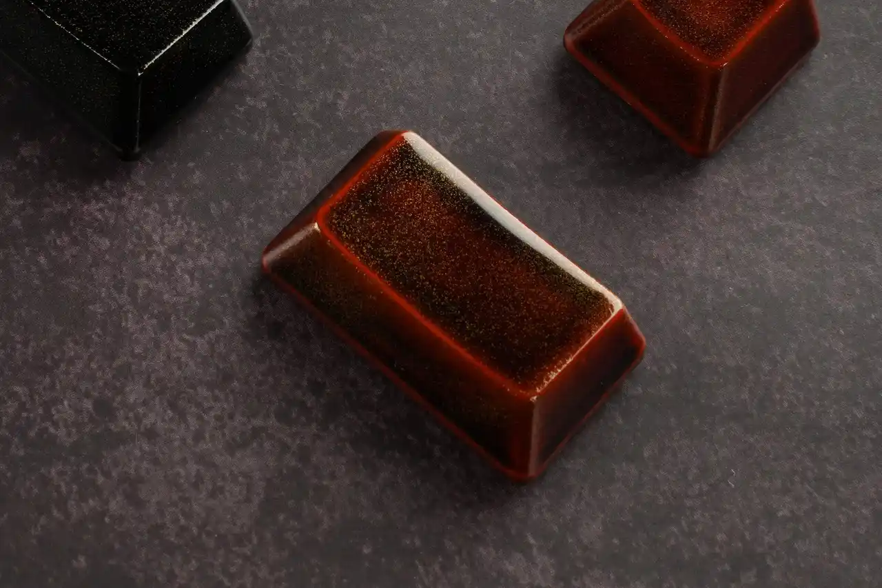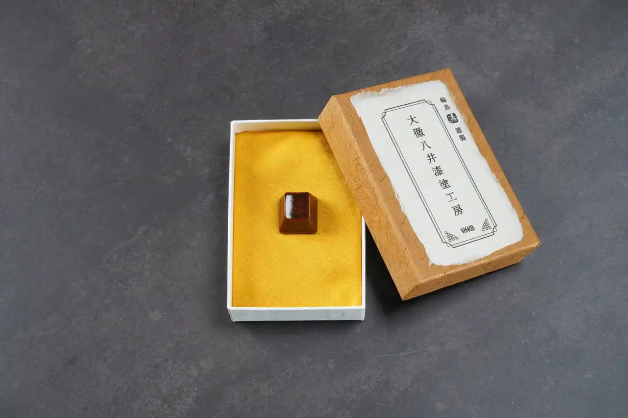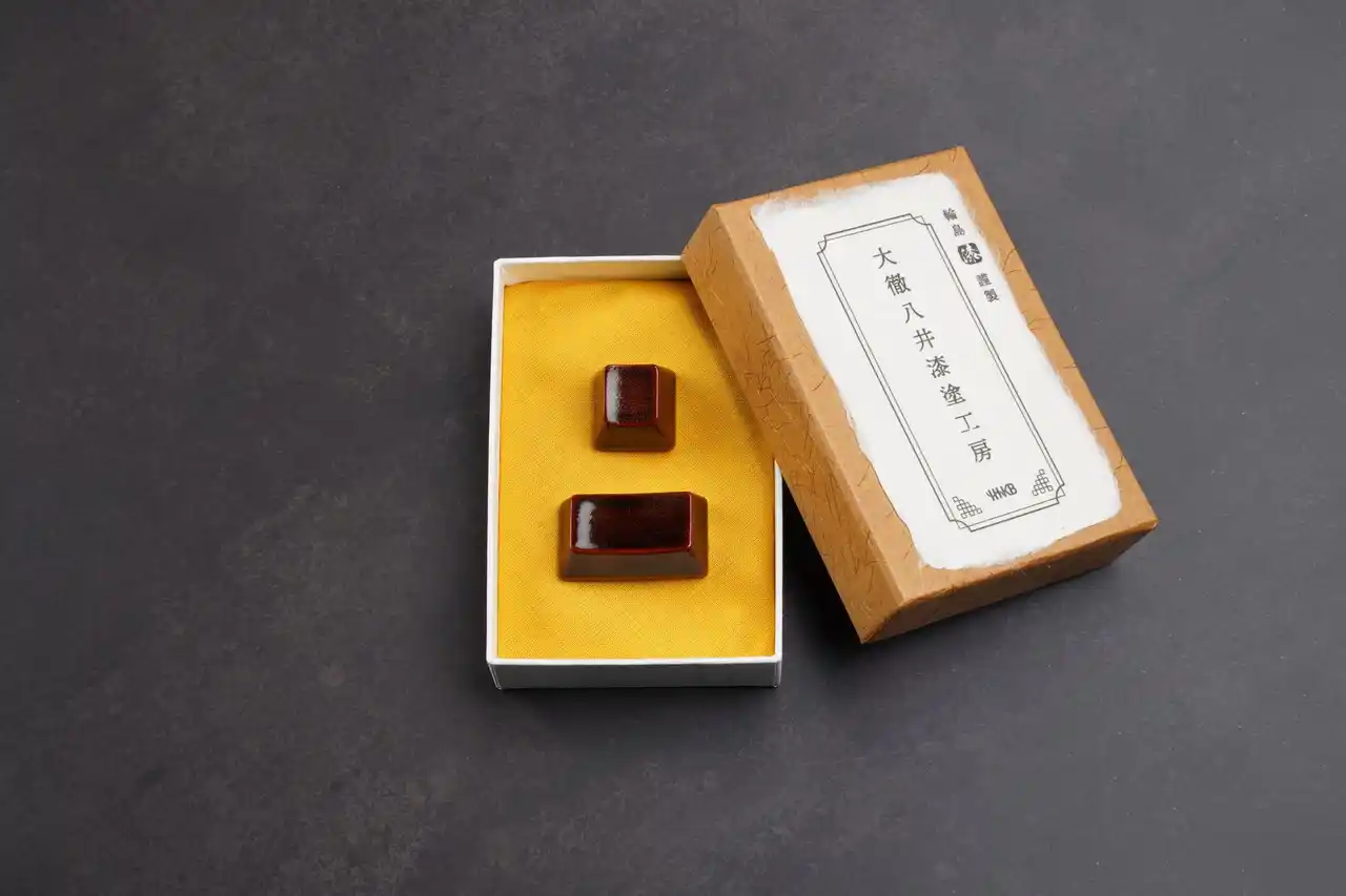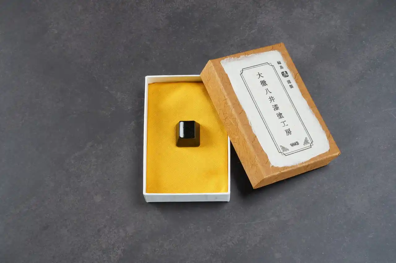 得て、PBT樹脂のキートップに「輪島塗の技法」を用いた「漆塗」を施しております。 |