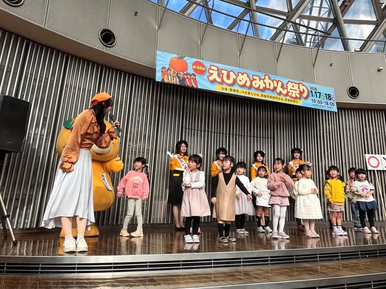 | 今回の「えひめみかん祭り」では、その出前授業でMCを務め、かんきつのお姉さんとして活動してきた高岡奈々葉さんが登場。出前授業に参加した園児の中から、ステージに参加してくれた子どもたちもおり、会場が一気に華やぎました。 | |||||||||||||||