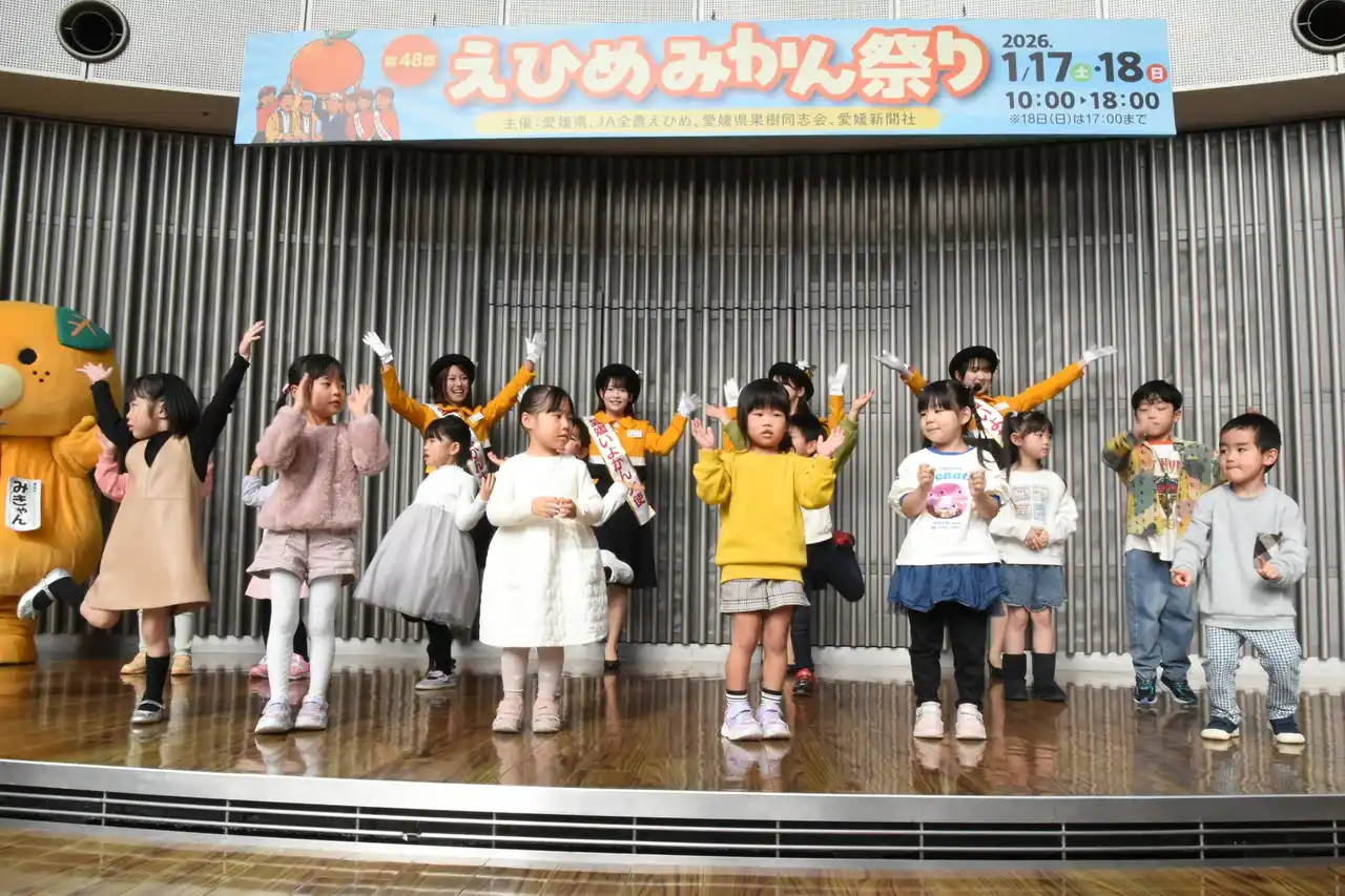 今回集まってくれた幼稚園のお友達14名と、愛媛いよかん大使の皆さんがステージに登場。 園児からは「かんきつ好き!」という元気な声も聞かれ、笑顔いっぱいに踊る姿がとても印象的でした。 |
