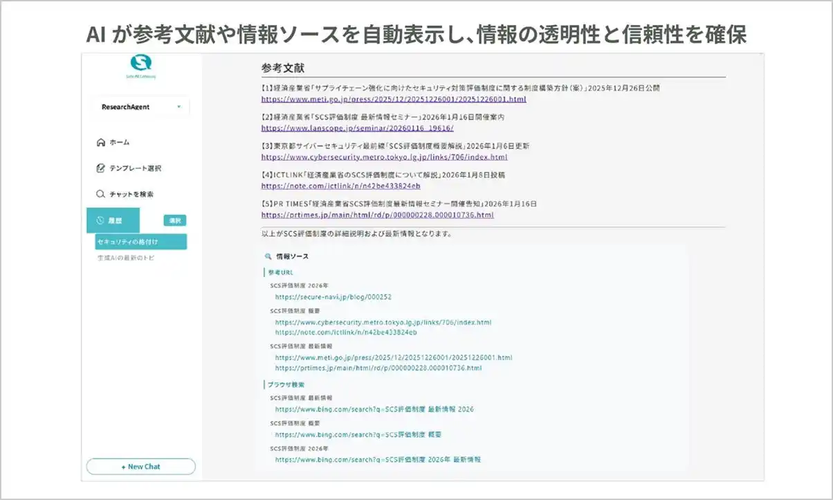 株式会社ソフトクリエイト(本社:東京都渋谷区/代表取締役社長:林 宗治、以下 ソフトクリエイト)は、企業・団体向け生成AIサービス「Safe AI Gateway」に、新たに「Research Agent」機能を追加したことをお知らせいたします。 |
