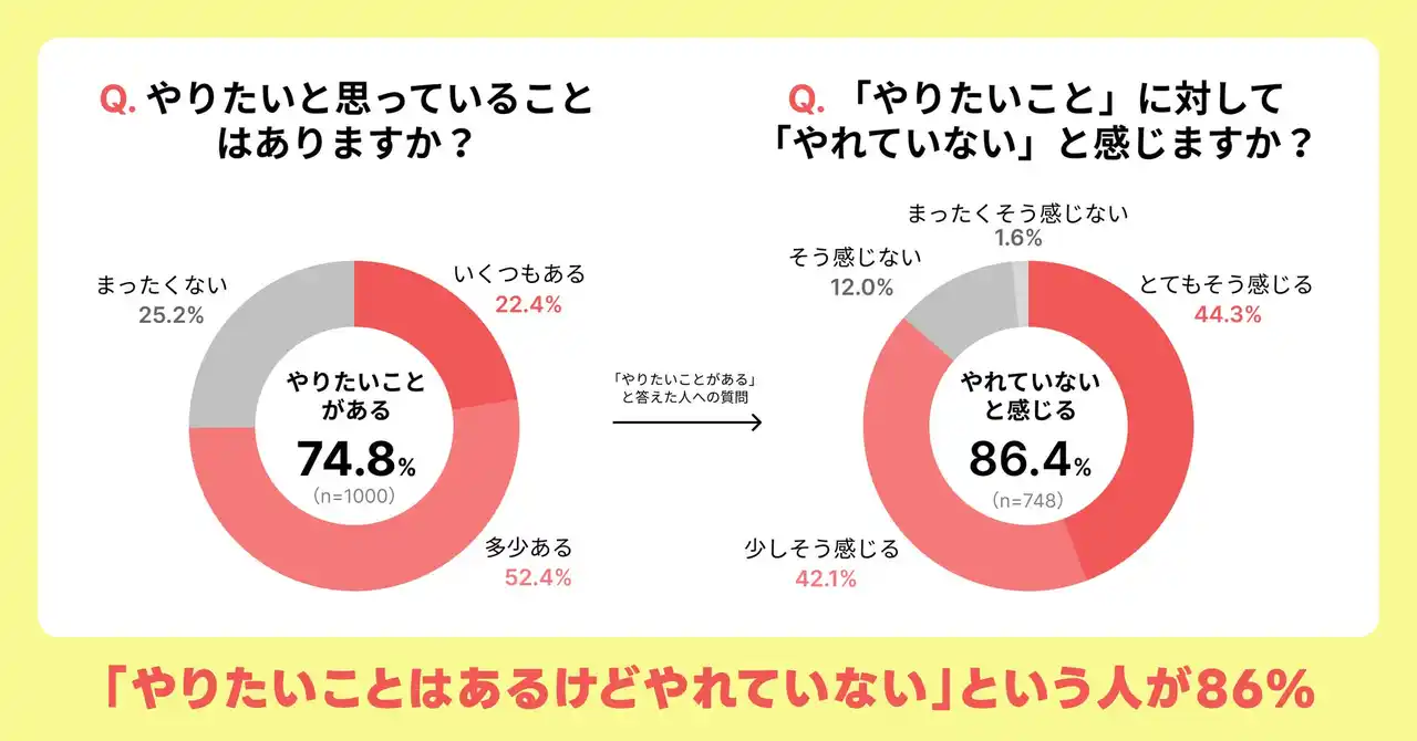 アンケート調査結果では、75%の人が「やりたいこと」を持っている一方で、その対象者に現状を尋ねると、86%もの人が「やりたいと思っているが、なかなかやれていない」と回答しました。 |