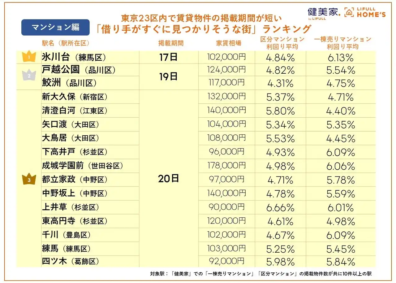 マンション編の1位は「氷川台」で掲載期間は17日となりました。東京メトロ有楽町線・副都心線の2路線が使え、池袋・渋谷方面へ直通できる交通利便性の高い駅です。家賃相場は102,000円、区分マンション利回り平均は4.84%、一棟売りマンション利回り平均は6.13%となっています。 |